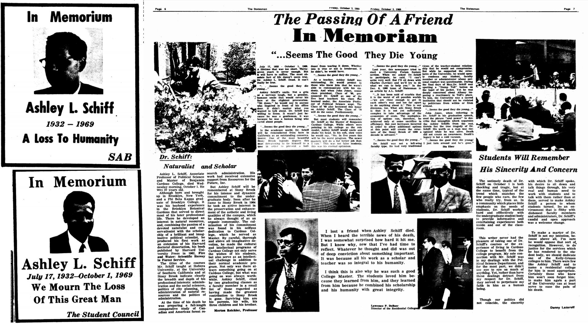 In the early fall of 1969, Dr. Ashley Schiff died suddenly and unexpectedly at the age of 37, leaving behind a wife and young family. His death shocked the young Stony Brook community, already seasoned to anti-war marches, intrusive drug raids, and serious student activism.