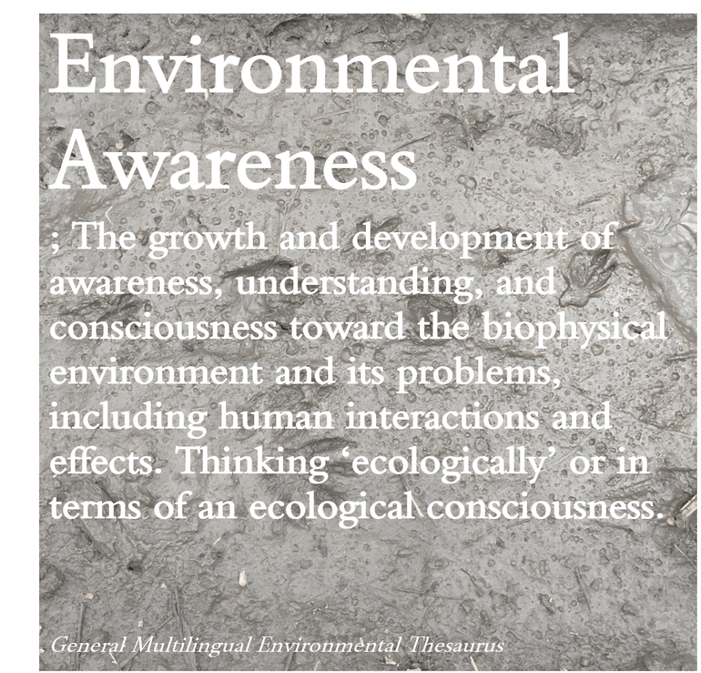 This week’s term is ‘Environmental Awareness’. Environmental Awareness means.. the growth and development of awareness, understanding and consciousness toward the biophysical environment and its problems, including human interactions and effects. Thinking “ecologically” or in terms of an ecological consciousness.