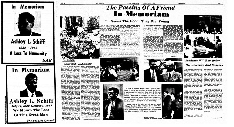 Ashley Schiff (1932-1969) fue un prestigioso profesor de ciencias políticas que se unió a la Universidad de Stony Brook en 1965. Era profundamente respetado entre los estudiantes por ser accesible, de mente abierta, “brutalmente honesto” y comprometido con la práctica y promoción de la integridad dentro de la comunidad universitaria.