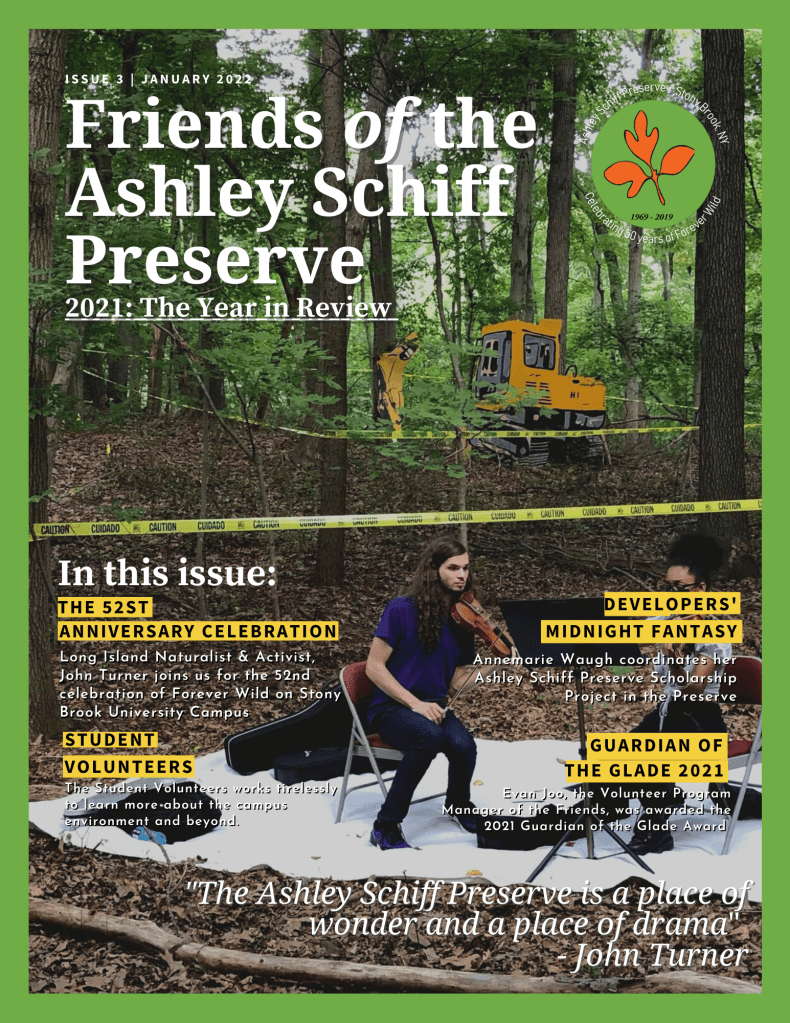 The Year in Review 2021 is out! In this issue, we talked about John Turner’s talk during the 52nd Anniversary of the Forever Wild, the work of the Student Volunteer Programs, and a special interview with Annemarie Waugh, the artist who conducted one of the most historic events at the Ashley Schiff Preserve this year.